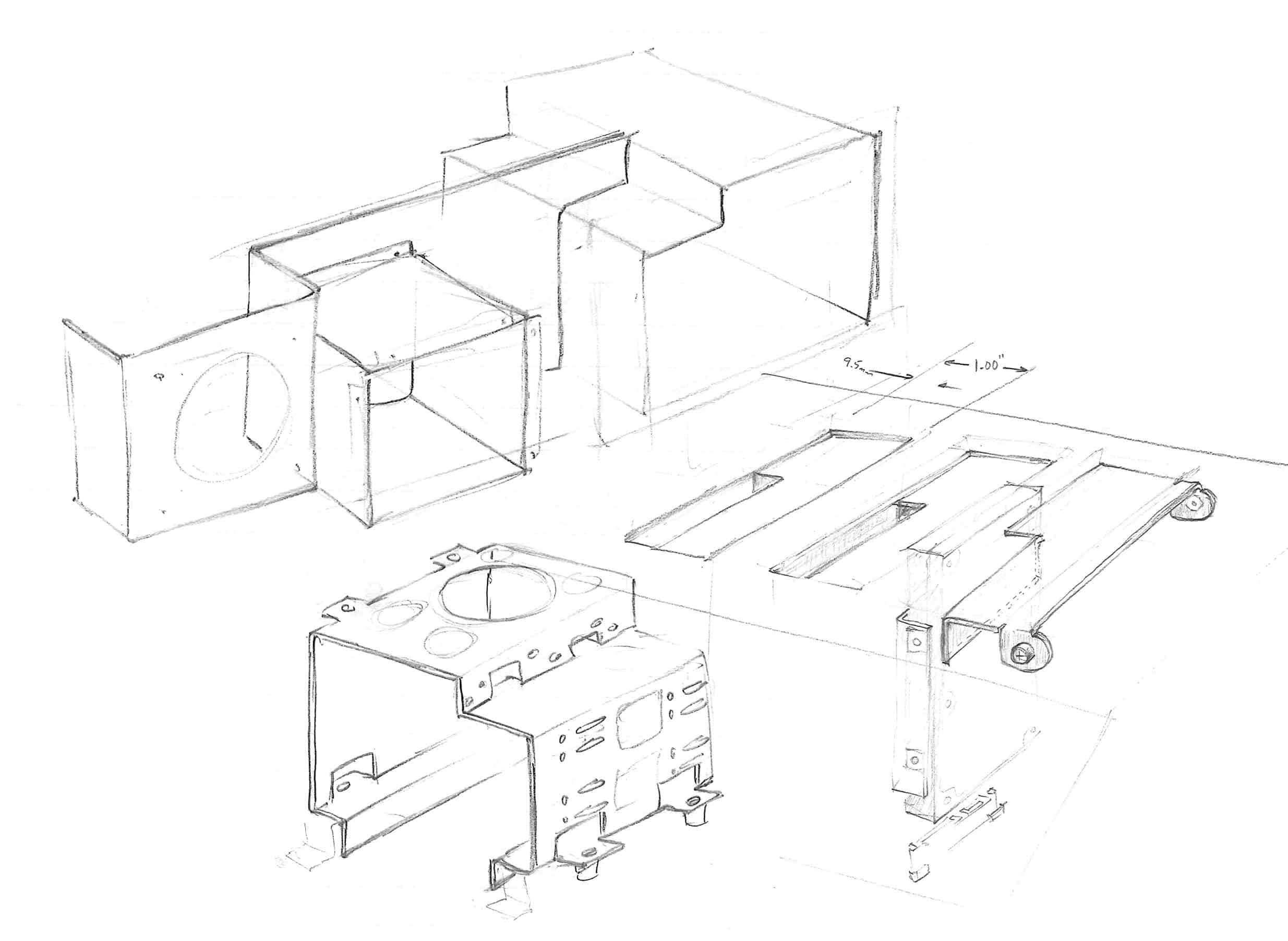 Generally, clear communication starts with hand drawn sketches. That is because we find that the quickest way to capture inspiration is with simple pencil and paper.  Sketching allows us to quickly and freely test out ideas and reveal problem areas. We can do this without the hesitation or sense of finality that precedes the precision. Freehand drawings like these can convey the look and feel of the project. They also help us to plan some of the more complicated parts of the chassis.